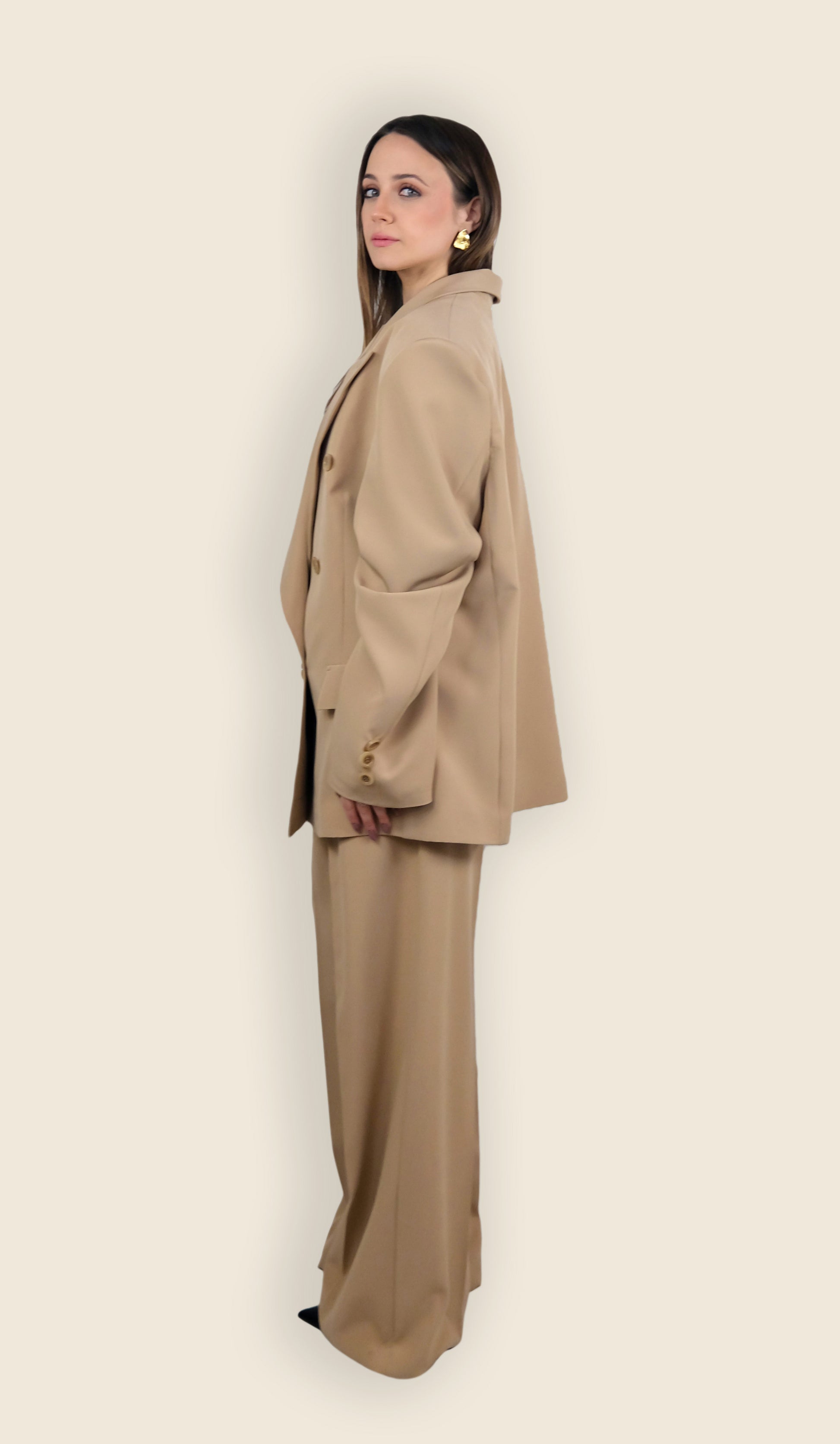 Blazer oversize con una struttura imponente. Le spalle sono accentuate con grandi spalline per conferire un senso di forza e determinazione. Il taglio è sartoriale ma con una vestibilità morbida, lasciando che il blazer avvolga il corpo. La chiusura è doppiopetto con un singolo bottone, mentre i dettagli includono tasche a filetto con pattina e fodera interna monocromatica.